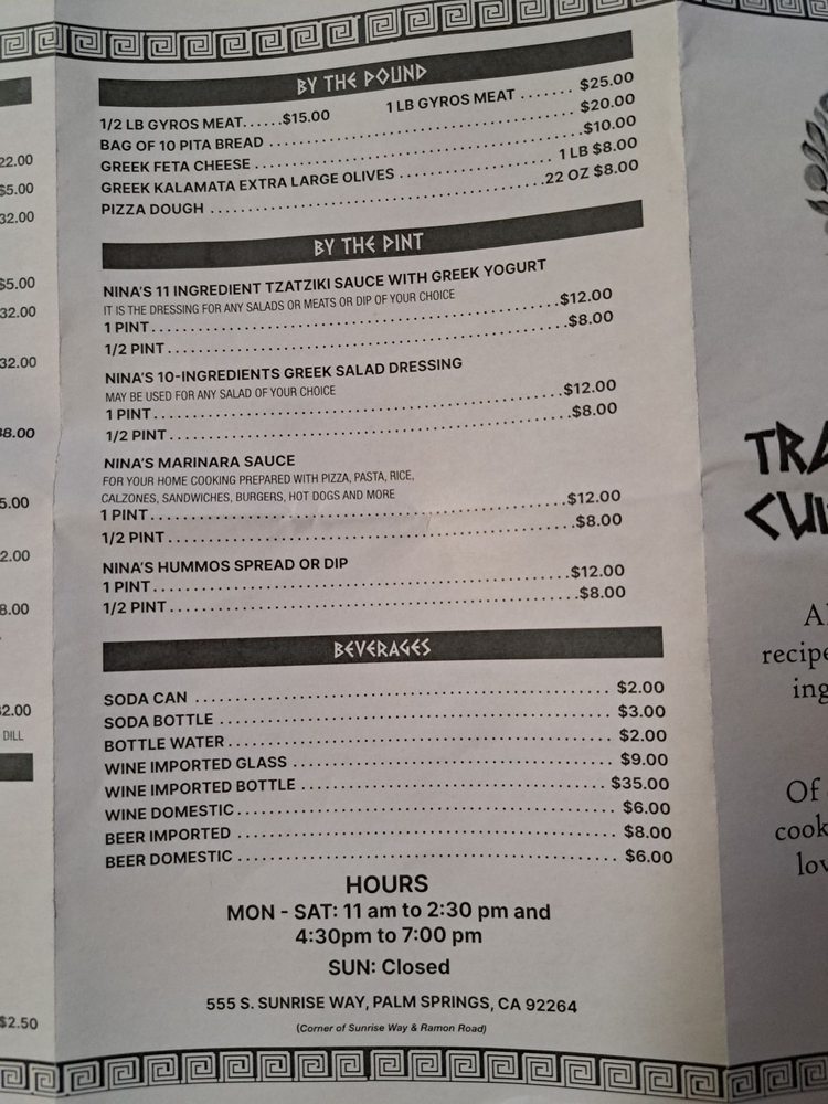 Introducing the menu at Nina’s Traditional Greek Cuisine & Pizzeria, a charming and quaint spot in Palm Springs offering traditional Greek and pizza dishes. With a focus on fresh, made-to-order meals, this family-owned restaurant delights guests with authentic flavors. Customer favorites include the gyro pizza, falafel wrap, meat supreme pizza, and Greek salad topped with a generous block of feta cheese. The menu also features lamb shanks, pasta dishes, and savory handmade Baklava for dessert. Authentic Greek beer and wines complement the meal perfectly. The warm and welcoming atmosphere, accompanied by Greek music, adds to the overall dining experience. Nina and her husband pride themselves on their hospitality and attention to detail, ensuring a memorable culinary adventure for visitors. Don't miss out on a taste of Greece at Nina’s!